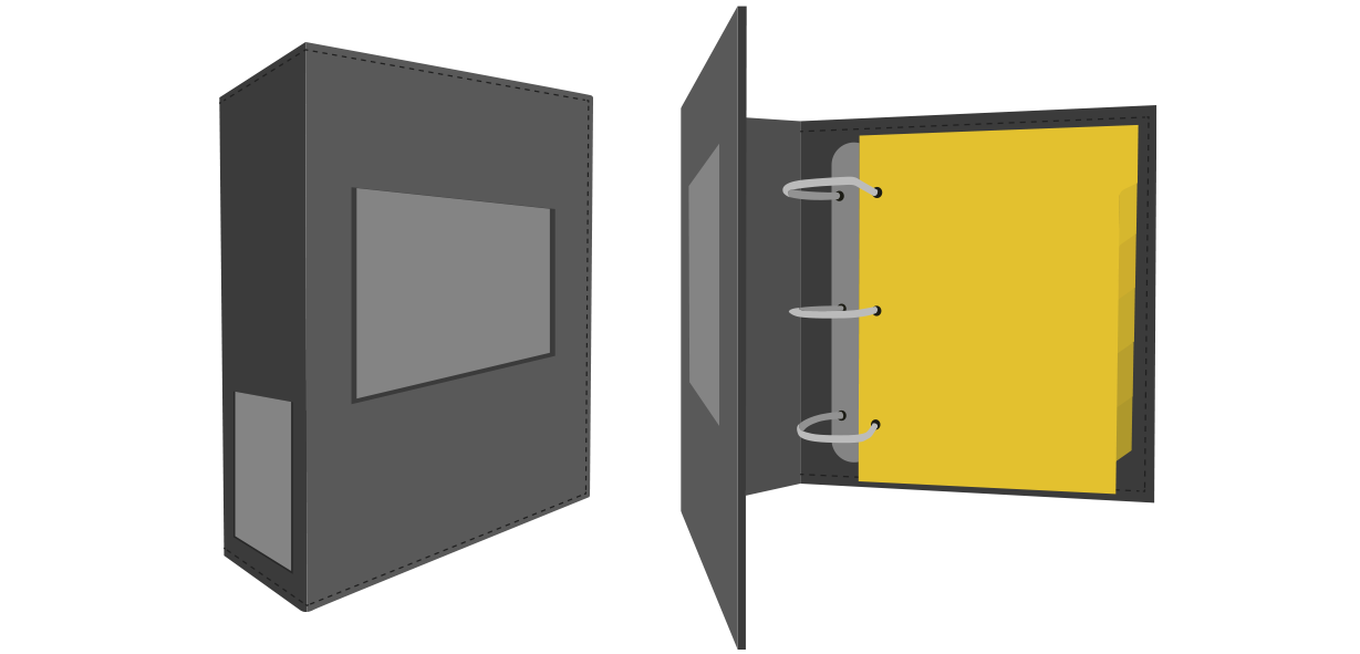Estas carpetas, en formato A5, están fabricadas con un material resistente y cosidas a mano con tres anillas. Cuentan con bolsillos para sujetar la tapa y el lomo.